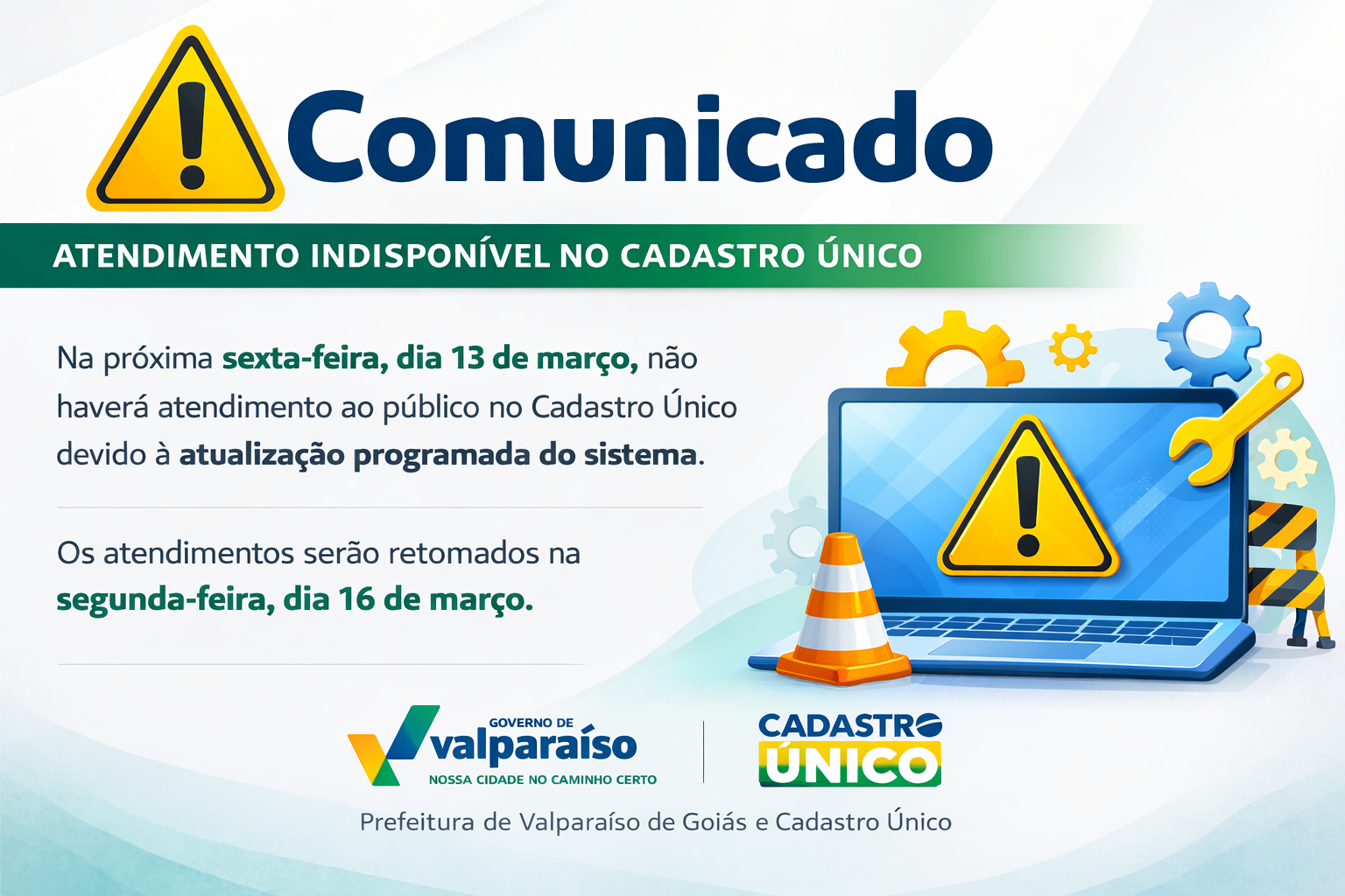 ATENDIMENTO DO CADASTRO ÚNICO SERÁ SUSPENSO NESTA SEXTA-FEIRA (13) PARA ATUALIZAÇÃO DO SISTEMA